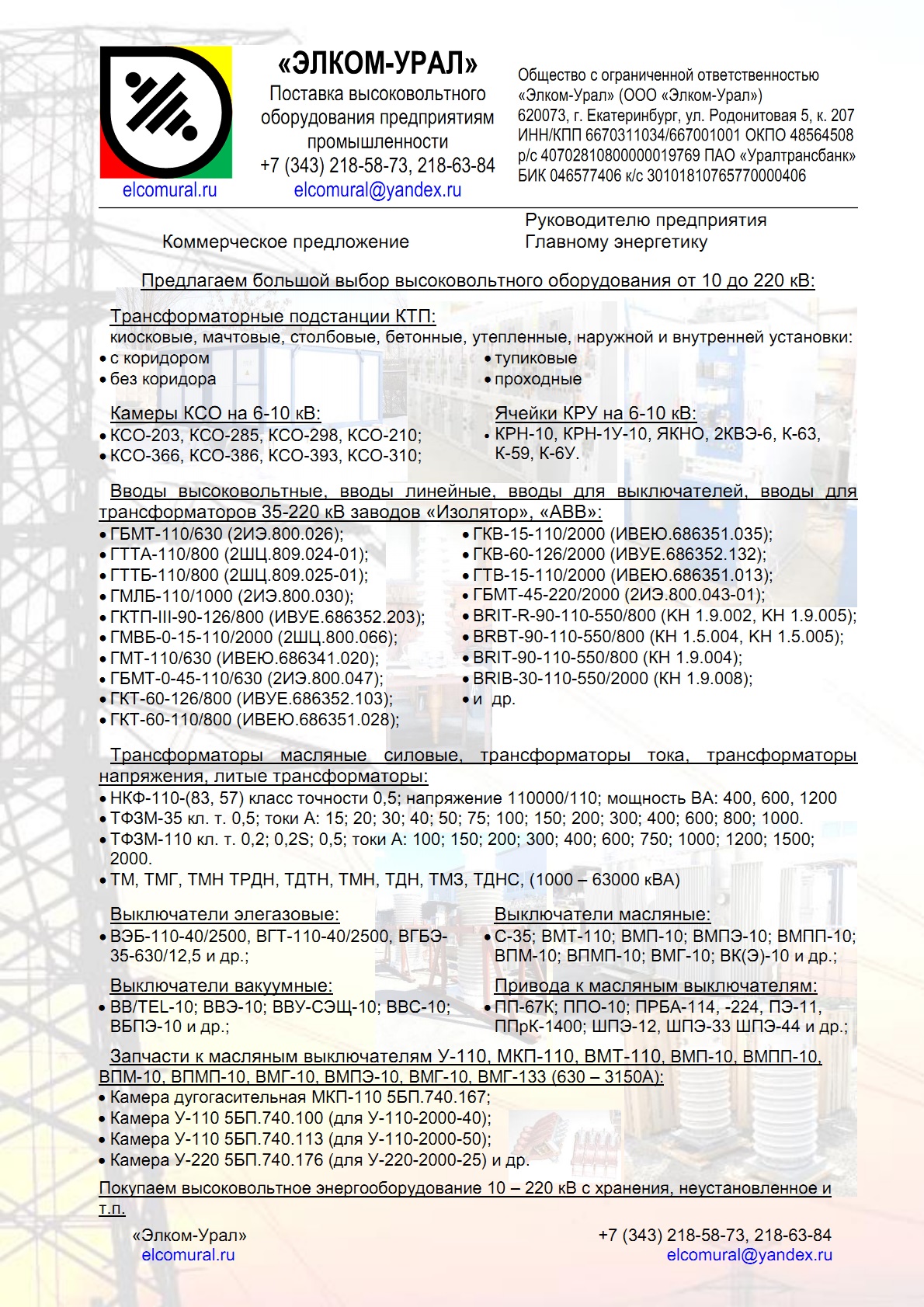 Добрый день! Предлагаю к поставке высоковольтное оборудование для объектов энергетики и предприятий промышленности. Трансформаторные подстанции КТП; Вводы высоковольтные (35 - 110 кВ), для выключателей, трансформаторов, вводы линейные; Выключатели элегазовые; Выключатели вакуумные; Выключатели масляные, привода к ним, … Читать дальшезапчасти; Трансформатор тока ТФЗМ-35, -110, -220; Трансформатор напряжения НКФ-110, -220; Трансформаторы силовые масляные ТМ, ТМГ, ТМЗ, ТМН, ТДНС, ТДТН, ТРДН, всех мощностей Доставка во все регионы России и страны СНГ. Доставка до ТК бесплатно. Купить оборудование, Москва, Санкт-Петербург, Новосибирск, Екатеринбург, Нижний Новгород, Казань, Челябинск, Омск, Самара, Ростов-на-Дону, Уфа, Красноярск, Пермь, Воронеж, Волгоград - Каледин Геннадий Александрович, директор Моб. тел. (МТС): +7 (912) 206-90-00 http://elcomural.ru "Элком-Урал", г. Екатеринбург тел.: +7 (343) 218-63-84, +7 (343) 218-58-73