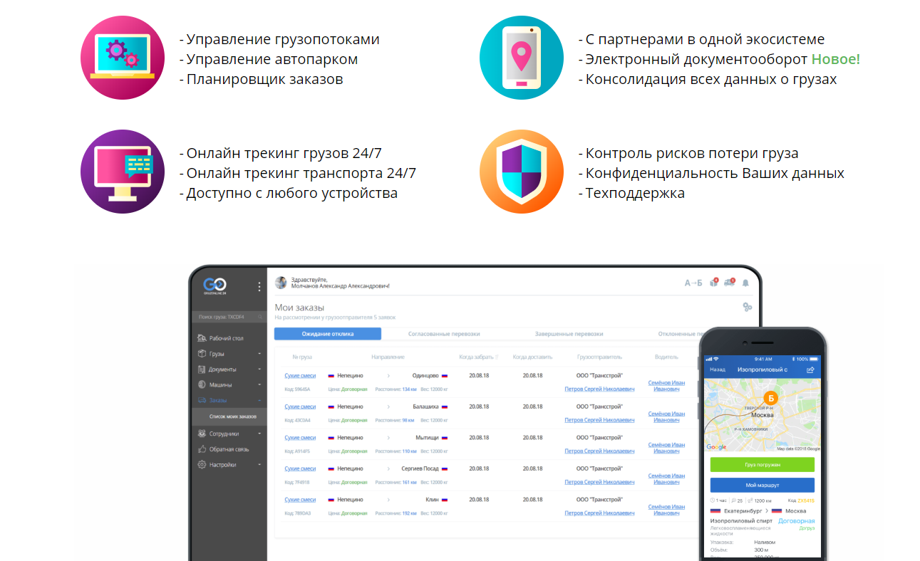 Добрый день! Gruzonline24 представляет сервис по контролю за грузом и транспортом в пути. Не нужен GPS и дорогостоящее оборудование. ВЭБ CRM и мобильное приложение водителя, работая в связке, будут предоставлять вам оперативную информацию о местоположении груза и транспорта, о графике загрузок и разгрузок. Если … Читать дальше водитель опаздывает на загрузку или загрузку - система оповестит вас! Но при этом вы будите всегда знать детали - что везут (подробно + фото), кто везет, какой транспорт, маршрут и др.
