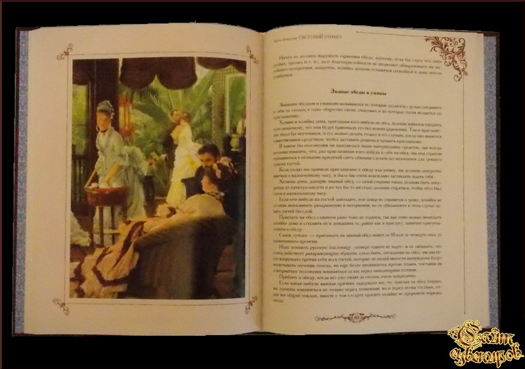 Русские традиции. Правила хорошего тона Утонченность, изящество манер, правила поведения в обществе, одним словом, этикет - всё это всегда живо интересовало людей и диктовало их поведение. Конечно, нормы этикета менялись со временем, каждая эпоха расставляла свои акценты, но желание человека выглядеть безупре… Читать дальшечно воспитанным оставалось неизменным. Мы предлагаем вашему вниманию уникальное издание конца XIX века. Вы узнаете, как вели себя дамы и кавалеры на балах и званых вечерах, как одевались на крестины и рауты, что полагалось дарить на дни рождении и свадьбы и т. д. Какие-то наставления и правила сегодня, несомненно, вызовут улыбку, но не сделают чтение этой книги менее интересным и полезным. Страниц: 304 (Мелованная) Масса: 1048 г Размеры: 265x203x21 мм, Кожаный переплет. Ручная работа. Тиснение золотой фольгой.